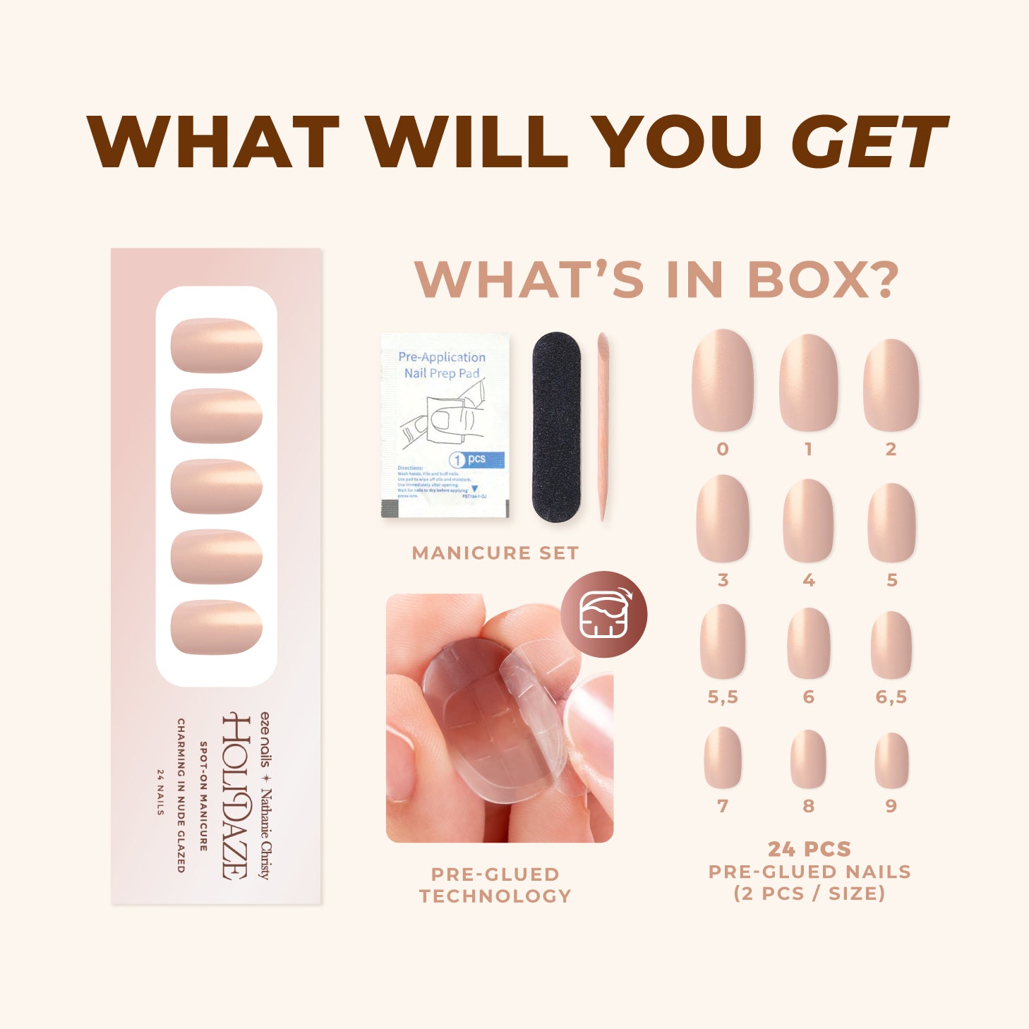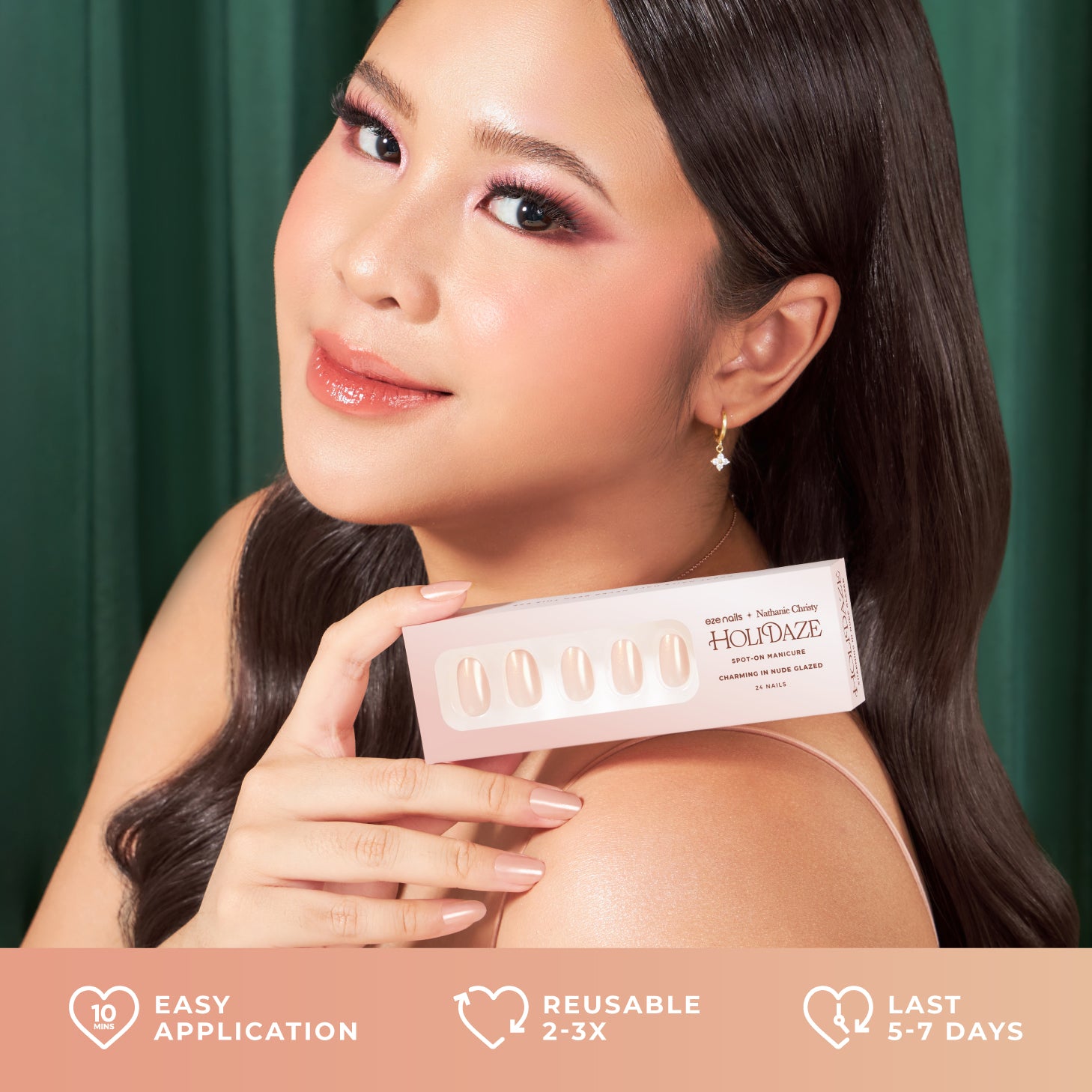 Glazed nude Spot-on Manicure, with a gold shimmer and a gel salon-like shine.