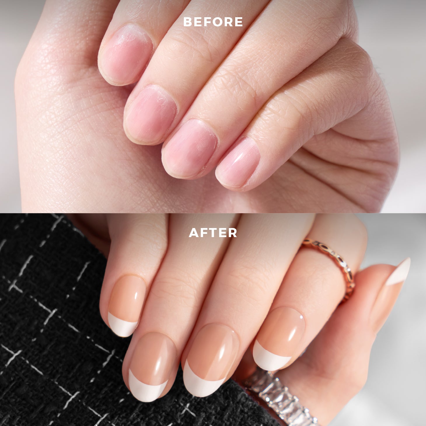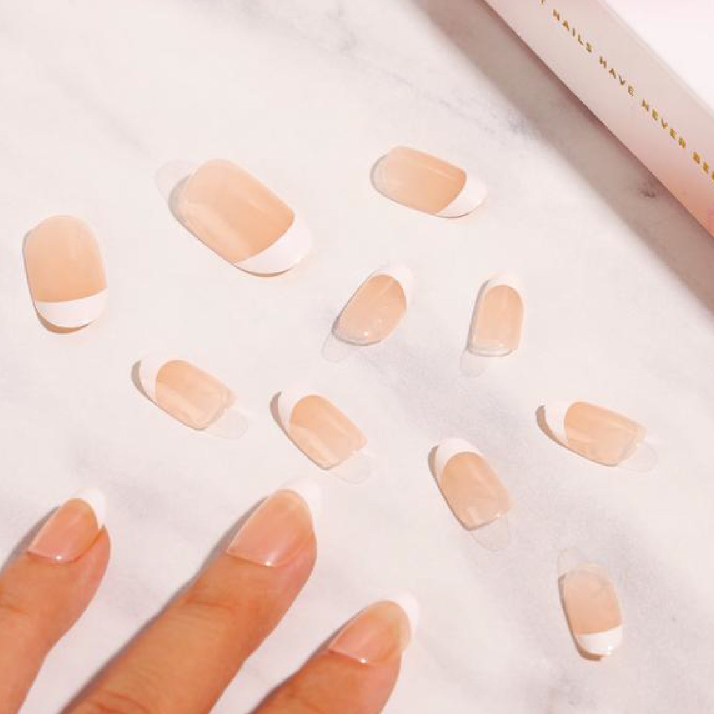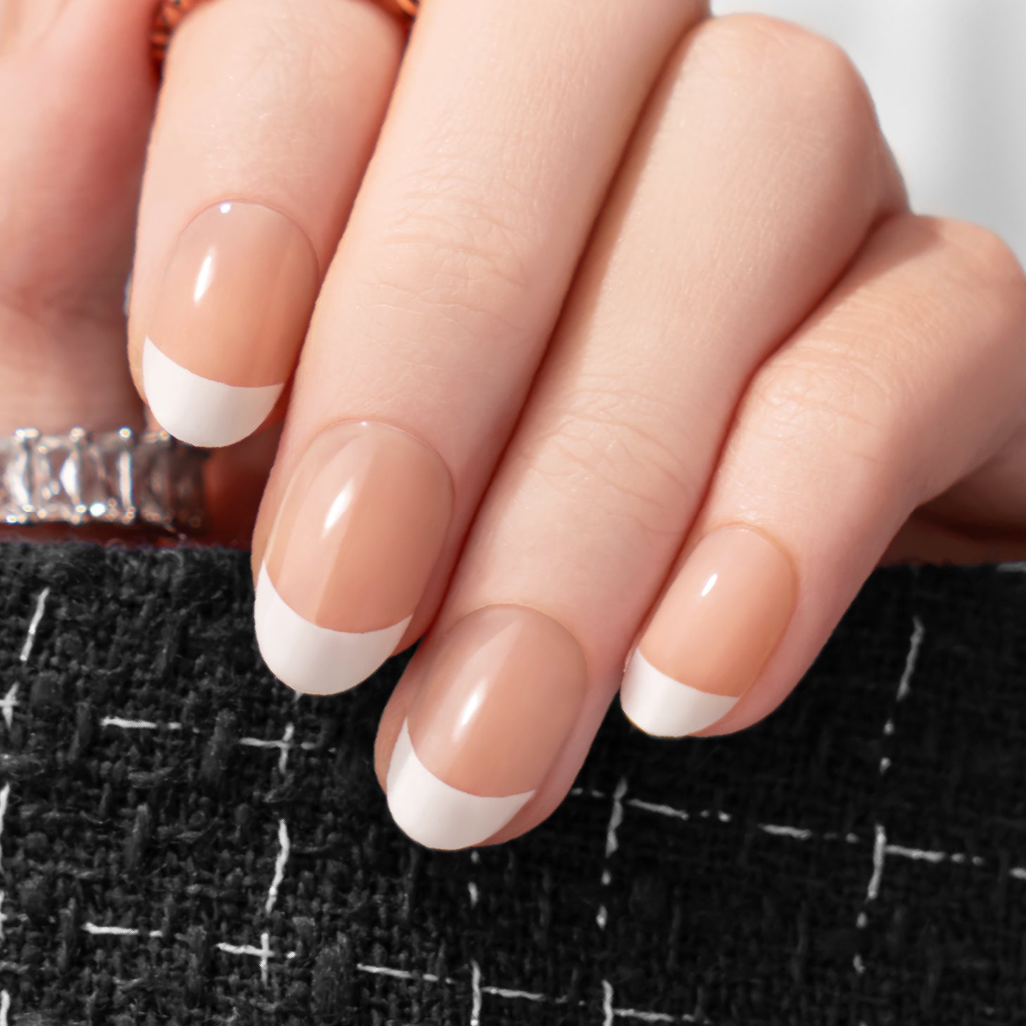 Classic white french tip and a semi-sheer nude base Spot-on Manicure, with a gel salon-like shine.
