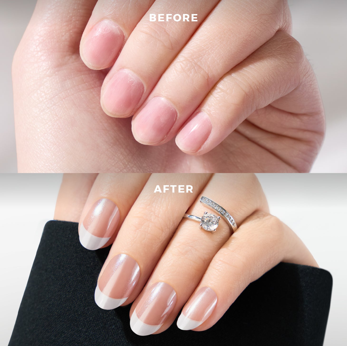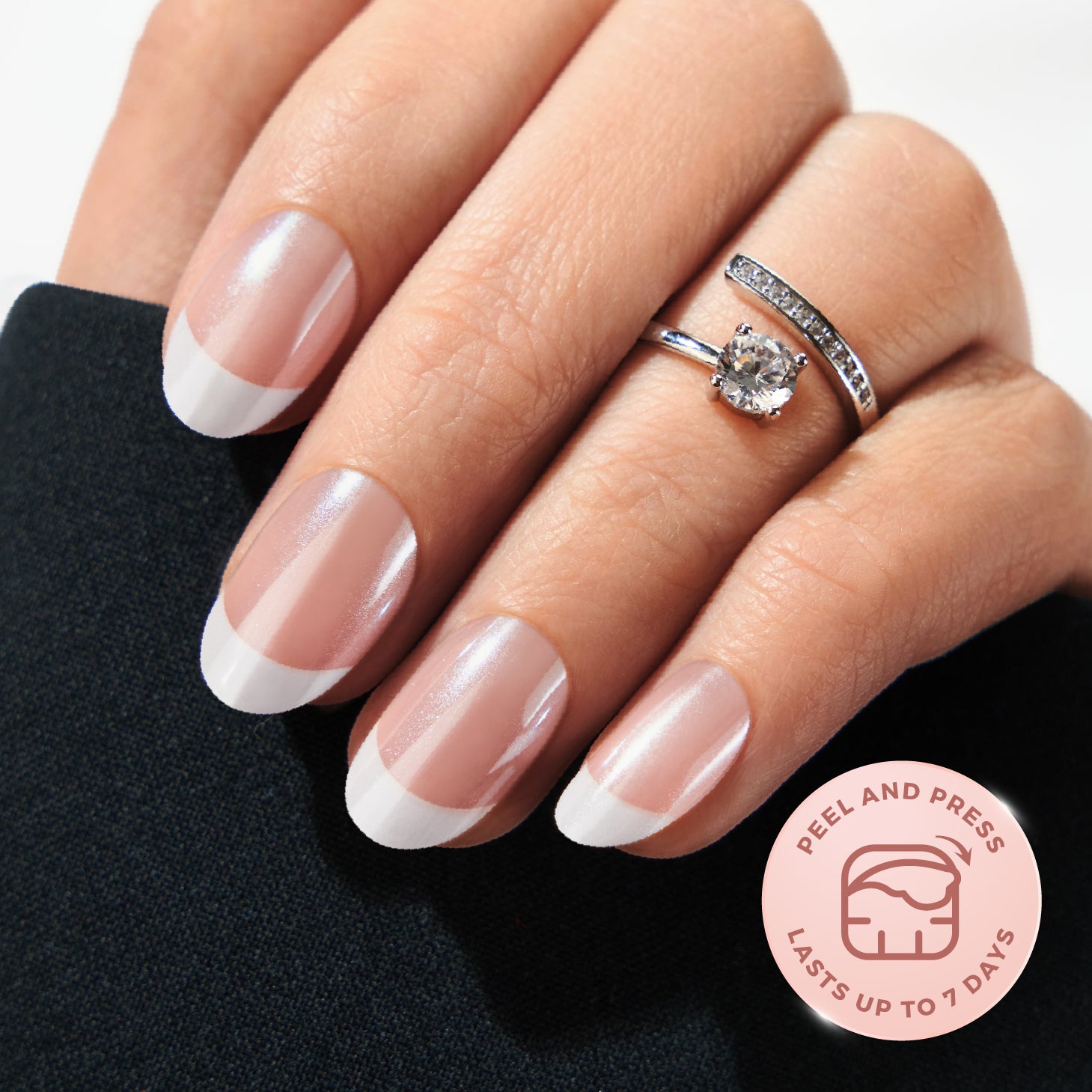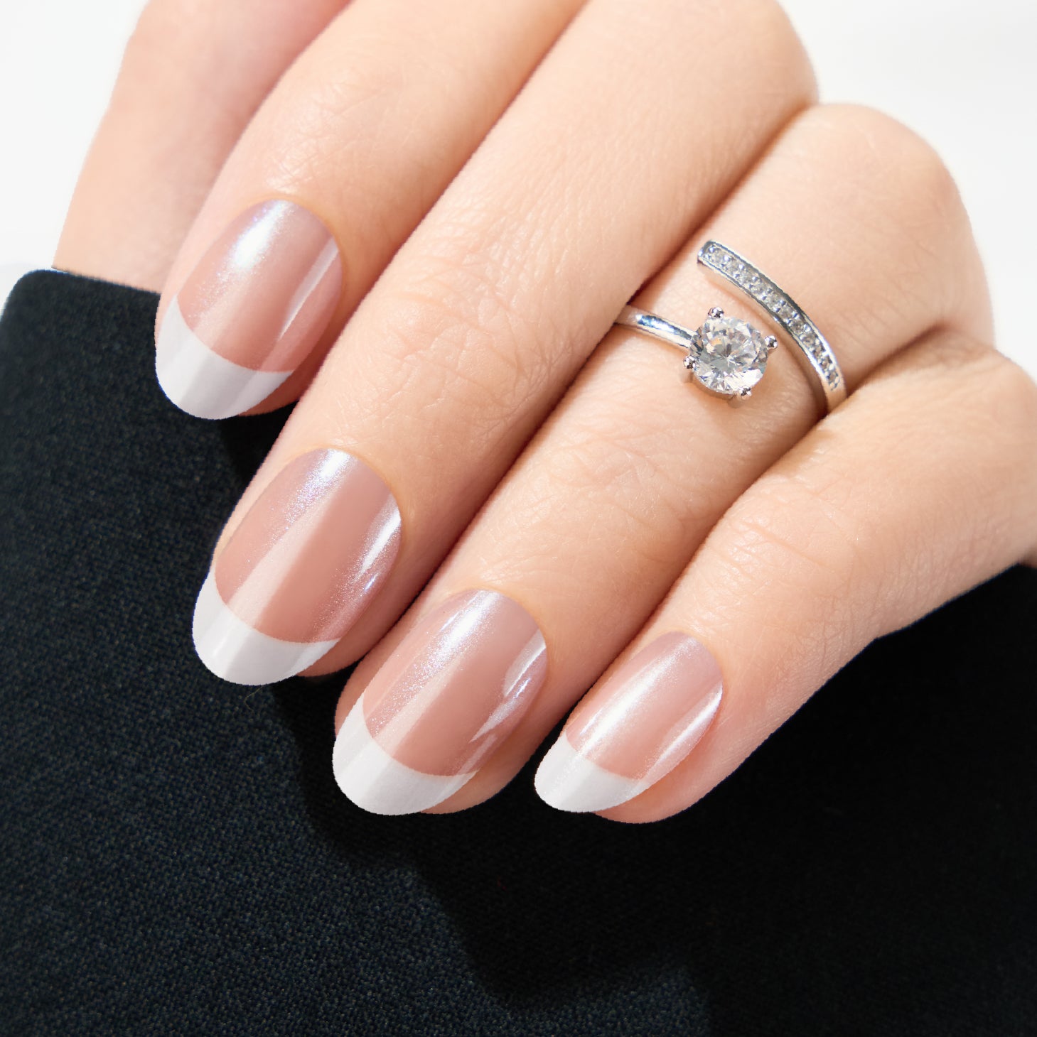 Classic white french tip and a semi-sheer nude base Spot-on Manicure, with a gel salon-like shine.