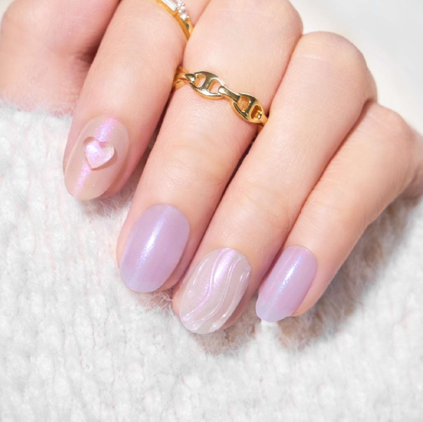 A mix of glazed pink and white Spot-on Manicure, with a 3D heart and wavy designs and a gel salon-like shine.
