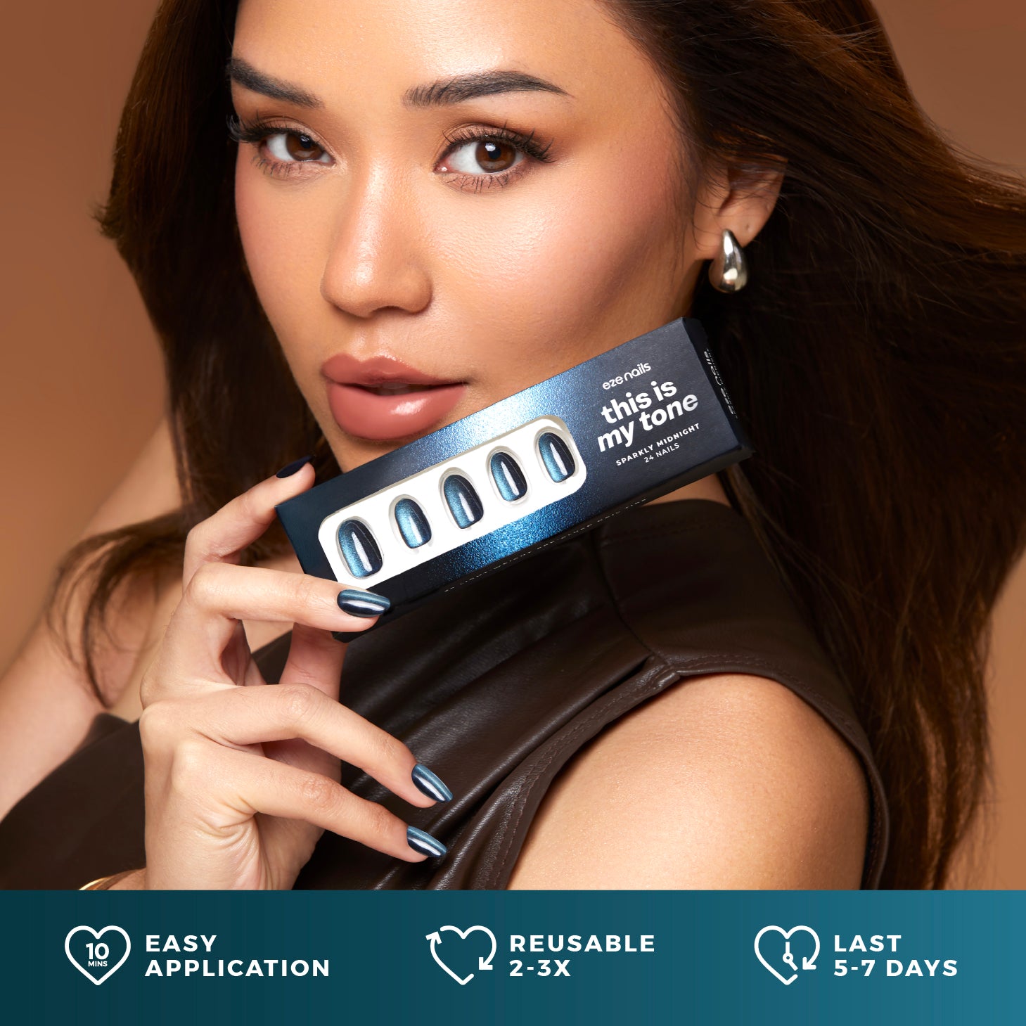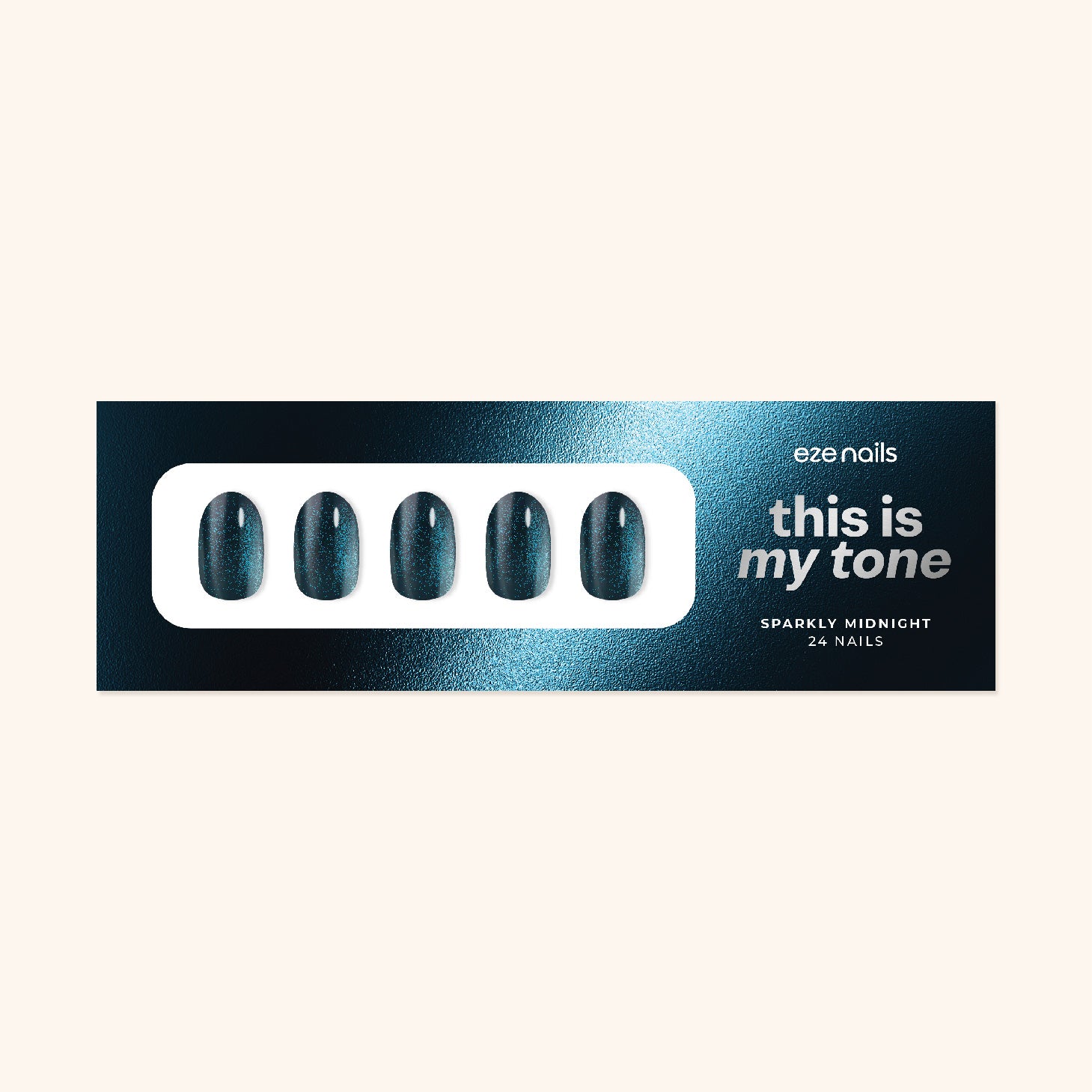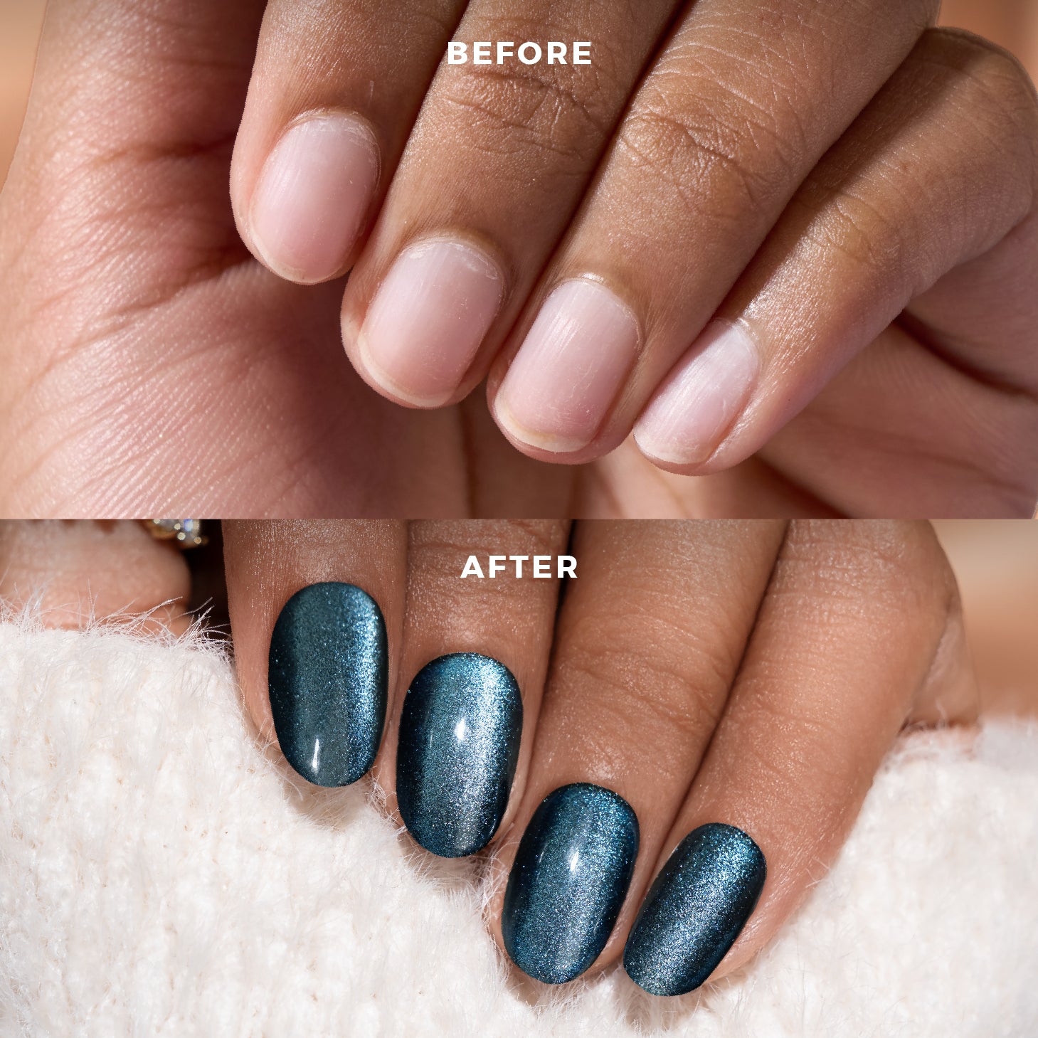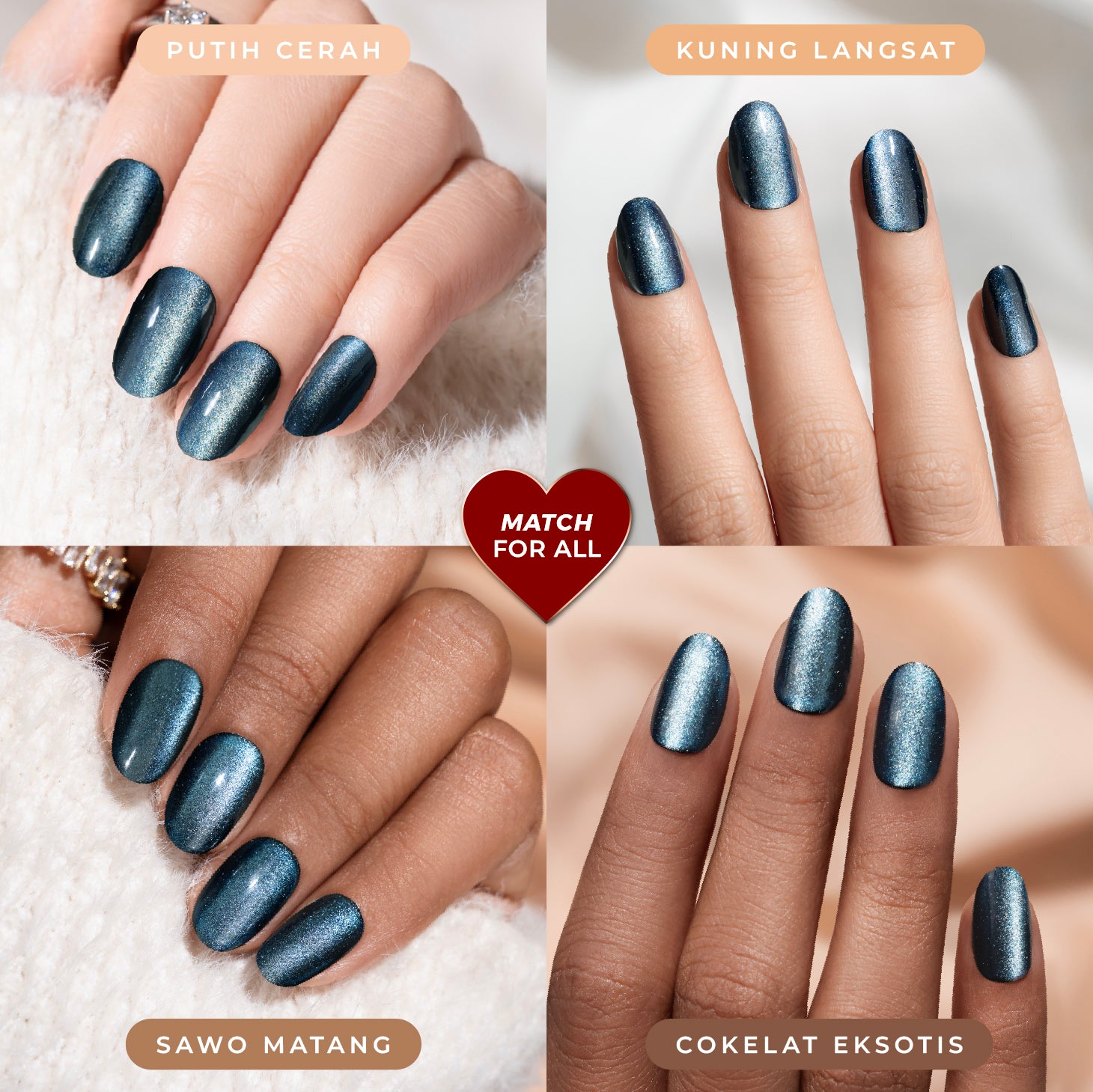 Deep blue Spot-on Manicure, with a cat eye finish and a gel salon-like shine.