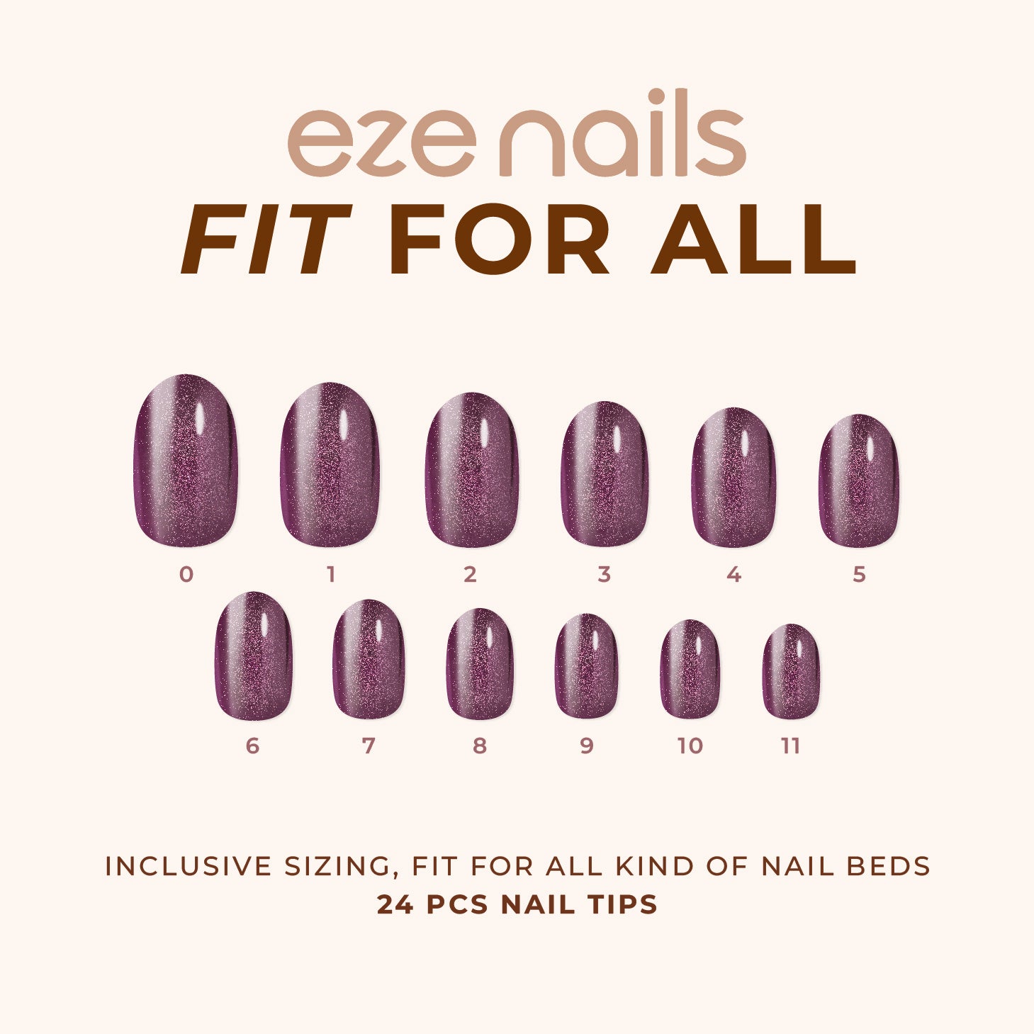 • 24–30 pcs Stay-On Nails — Tersedia dalam 12 ukuran, dirancang untuk kuku terkecil hingga terbesar, jadi tidak perlu memilih size.