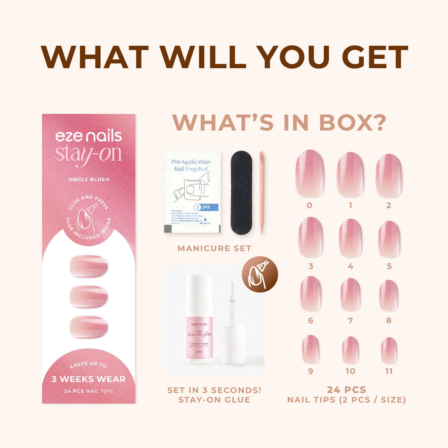 • 24–30 pcs Stay-On Nails — Tersedia dalam 12 ukuran, dirancang untuk kuku terkecil hingga terbesar, jadi tidak perlu memilih size.
