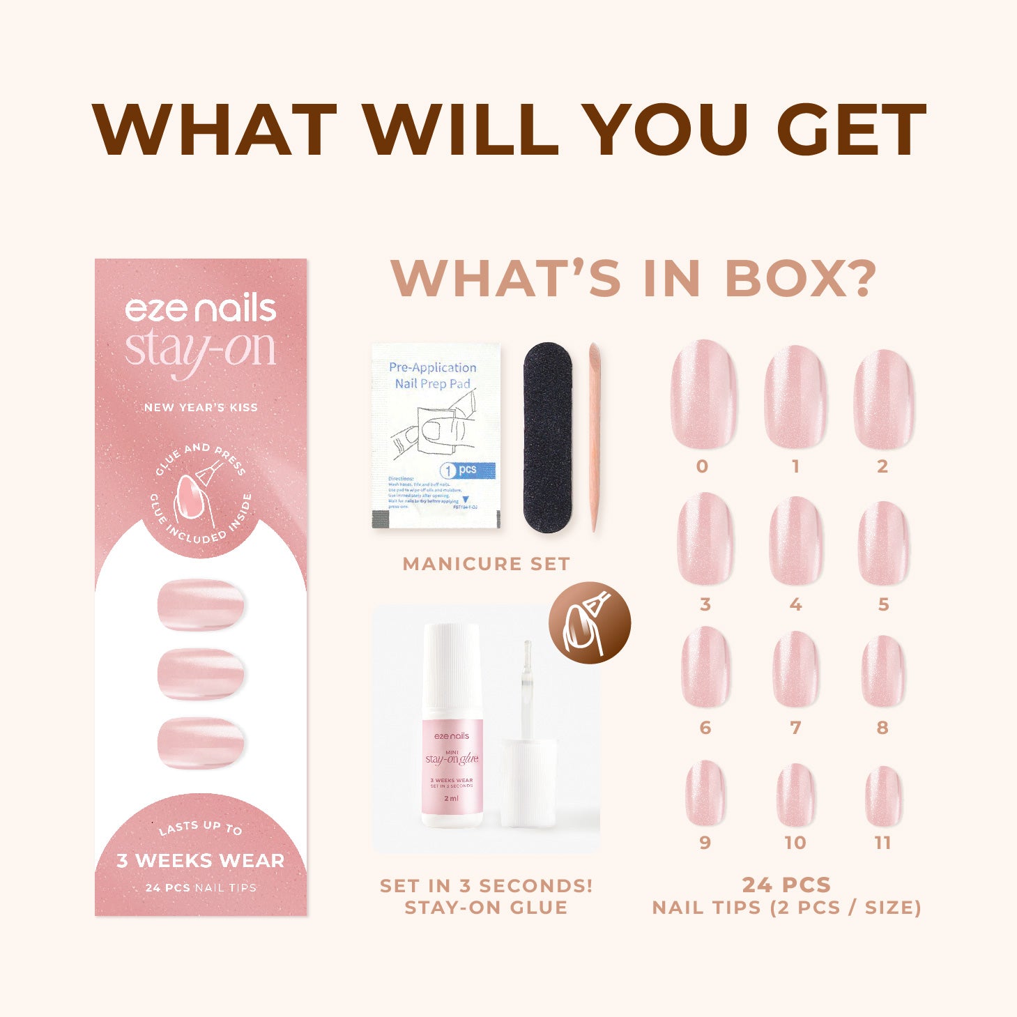 • 24–30 pcs Stay-On Nails — Tersedia dalam 12 ukuran, dirancang untuk kuku terkecil hingga terbesar, jadi tidak perlu memilih size.